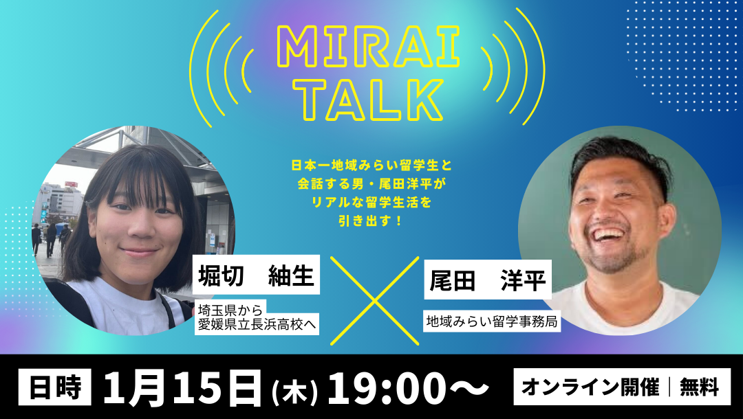 「地域みらい留学って、実際どんな学校があるの?👀」~個性豊かな学校と出逢える留学説明会!~地域みらい留学にちょっと興味がある中学1・2年生・保護者の皆さまへ🎉【地域みらい留学とは】地域みらい留学は、170校を超える日本各地にある魅力的な公立高校の中から、住んでいる都道府県の枠を超えて、自分の興味関心にあった高校を選択し、高校3年間をその地域で過ごす国内進学プログラムです。これまで地域みらい留学生は累計約4,250名に✨寮やホームステイでの生活を通して、学校の先生だけでなく、高校と地域を結ぶコーディネーターや寮のスタッフ等が生活をサポートあなたのやりたいことを地域の大人たちが全力サポートで実現都会では味わえない豊かな自然の中での生活が可能詳細はこちらでご確認ください💁♀️【おすすめな人】・最近地域みらい留学を知って、これから行きたい学校を選ぶ中学1・2年生・サイトだけでは分からない、リアルな学校の雰囲気・魅力を知りたい方・どうやって学校を選んだらいいのか迷っている方今回のイベント内でご紹介する学校はすべて個性あふれる魅力的な学校たち!! ここであなたの「理想の学校」のイメージを膨らませよう!!!【説明会内容】※すべて顔出し、お声出し不要です。①20分で診断!興味のある学校候補が出てくるワーク②学校のプレゼンを動画で見てみよう。③視聴した学校の中で興味がある学校について考える。①~③を通してワクワクする理想の学校を見つける!【個別説明会&春のオープンスクールまとめも公開予定!】一部の学校では当日13時以降~3月末ごろまでに個別説明会を実施!!また、春(4月~6月)にオープンスクールを実施する学校も順次公開予定!まだ進路決定までは時間がある中1・2年生だからこそ、 今のうちにたくさんの学校を見て、知っておくことが大切です。「こんな学校、本当にあったんだ!」 そんな新しい出会いが、あなたの未来を広げるきっかけになるはず。 当日、オンラインでお待ちしております!🌟参加する学校はComing Soon...!※随時更新